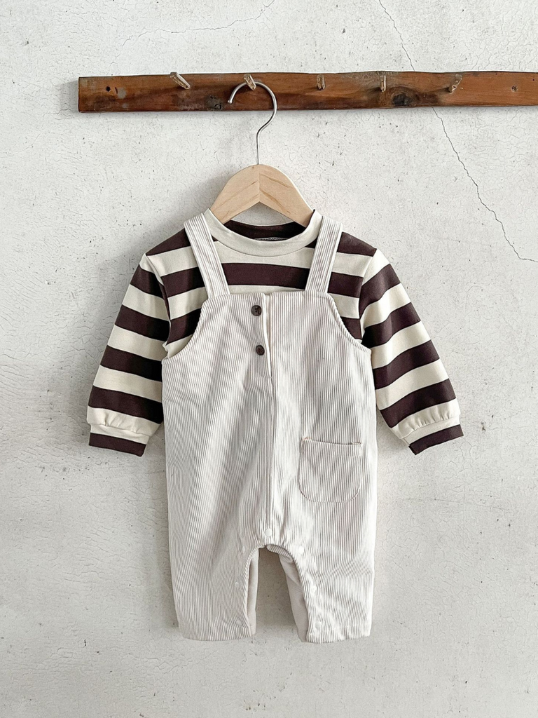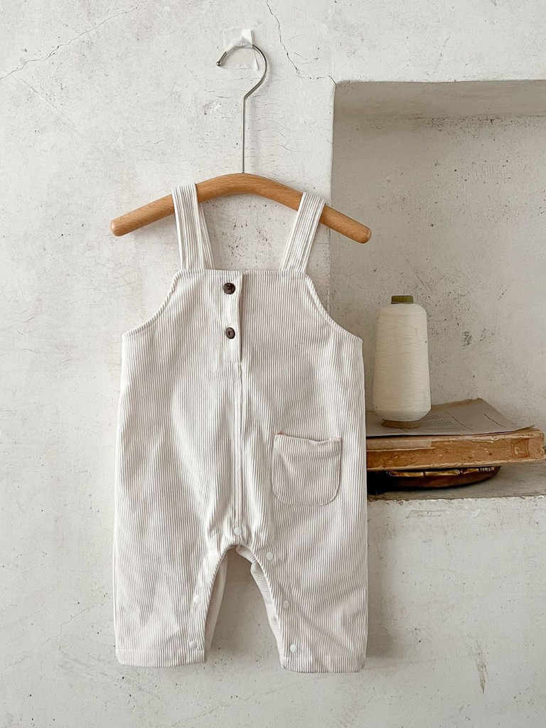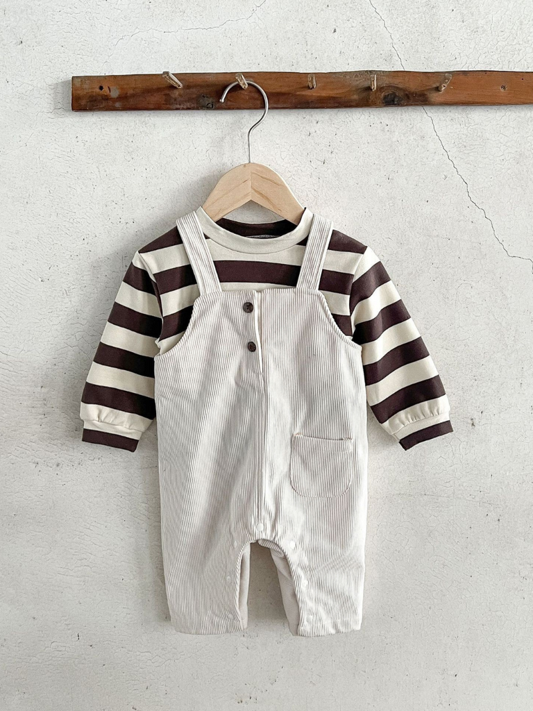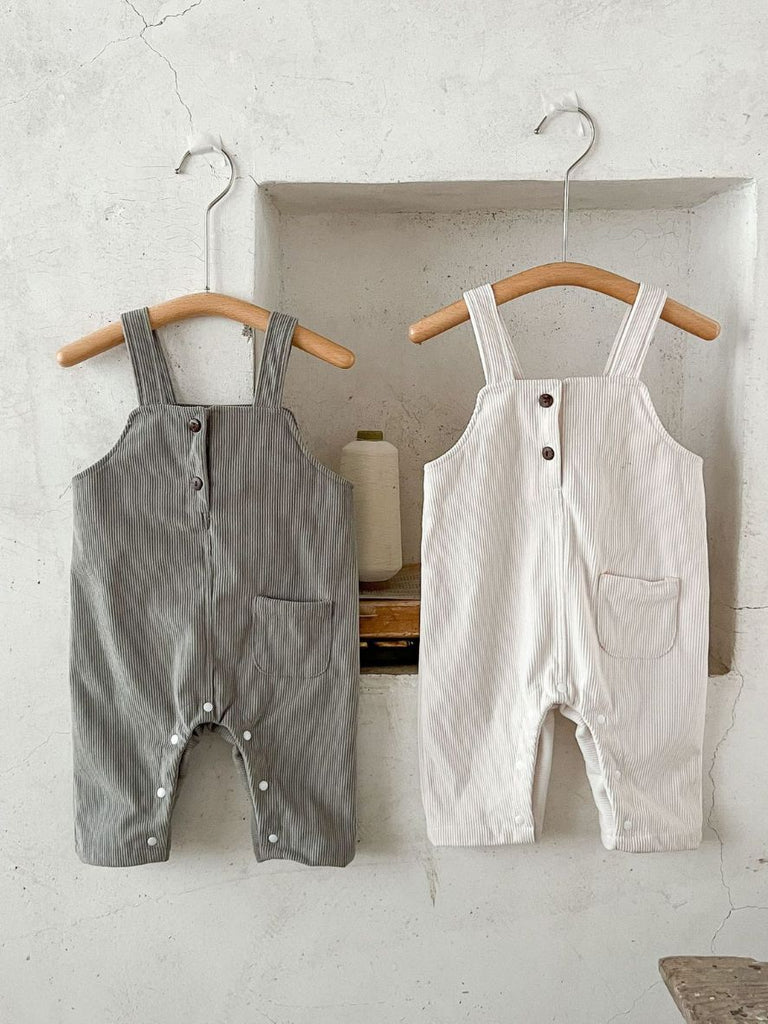These adorable and functional baby jumpsuit overalls are a must-have for any baby wardrobe. Made from soft, breathable fabric, these overalls are perfect for daily wear, providing comfort and style. Featuring a classic striped pattern in beige and white, they offer a timeless and neutral look suitable for any occasion. With convenient buttons and a simple design, these overalls make dressing your little one a breeze.