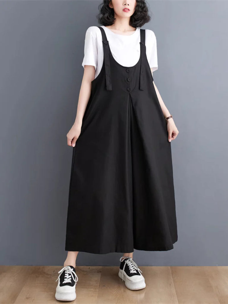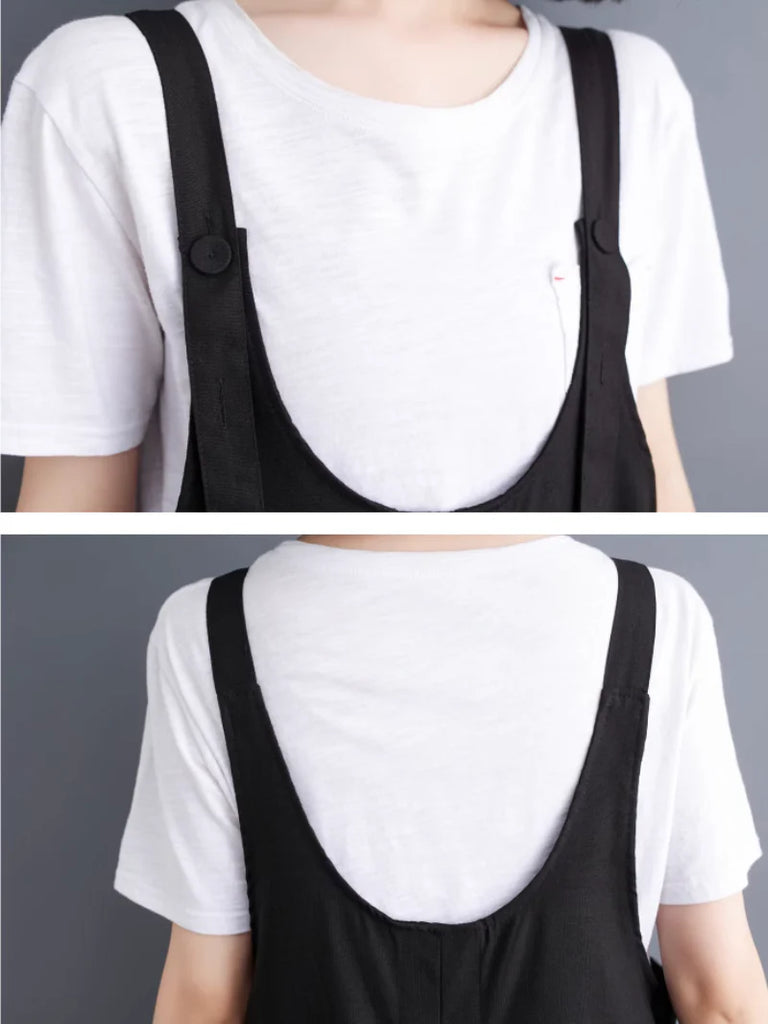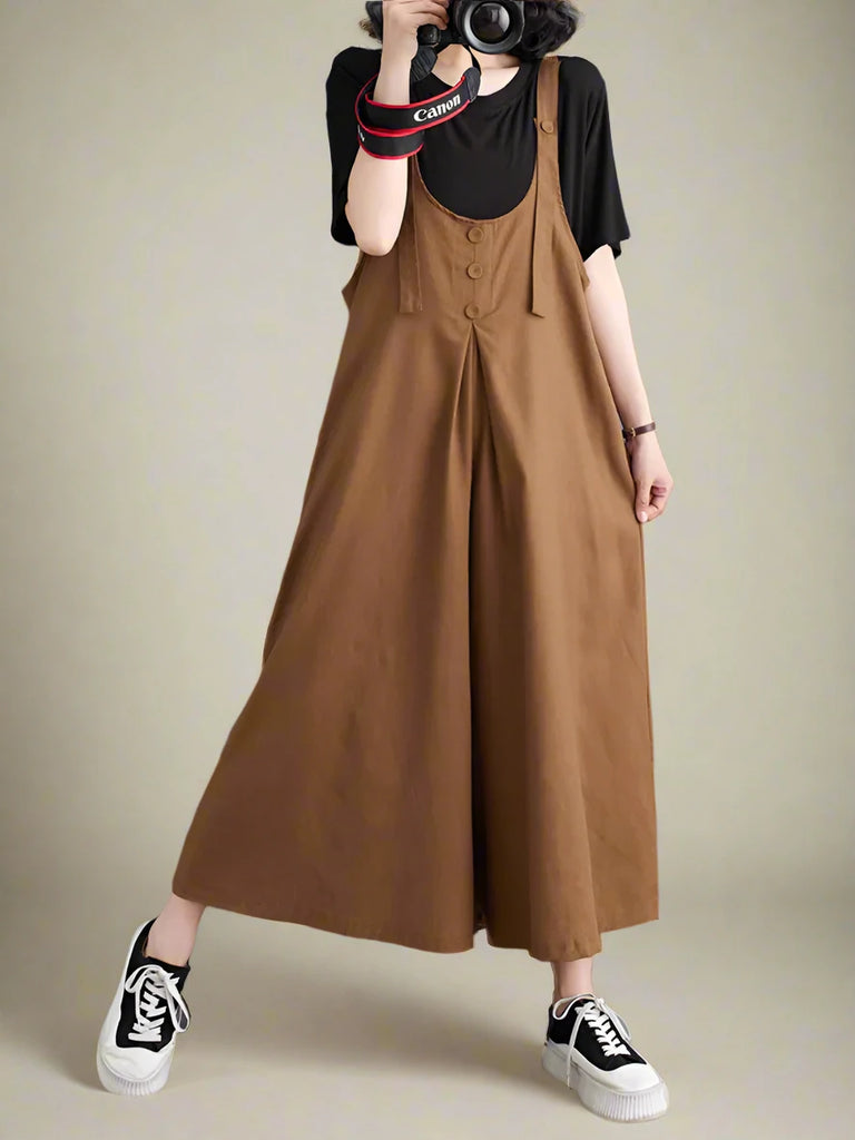 These dungarees are made from a cotton and flex blend, designed for both comfort and style. The wide-leg fit provides flexibility, while the button-front design and adjustable straps ensure a secure, customizable fit. With functional side pockets and a vintage-inspired look, they pair effortlessly with various tops for casual wear. They are available in beige, black, brown, and green, these dungarees add a trendy, laid-back vibe to your wardrobe while keeping you comfortable all day.
