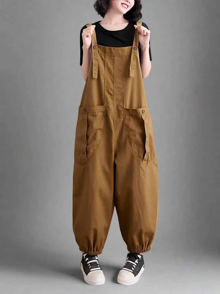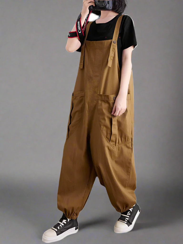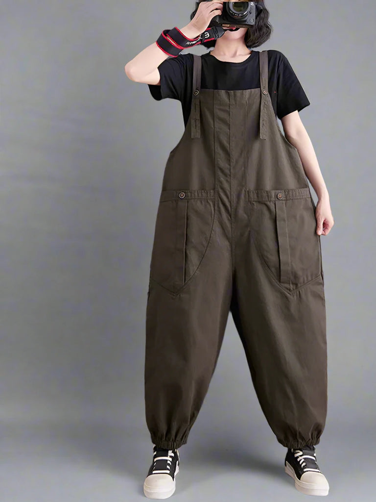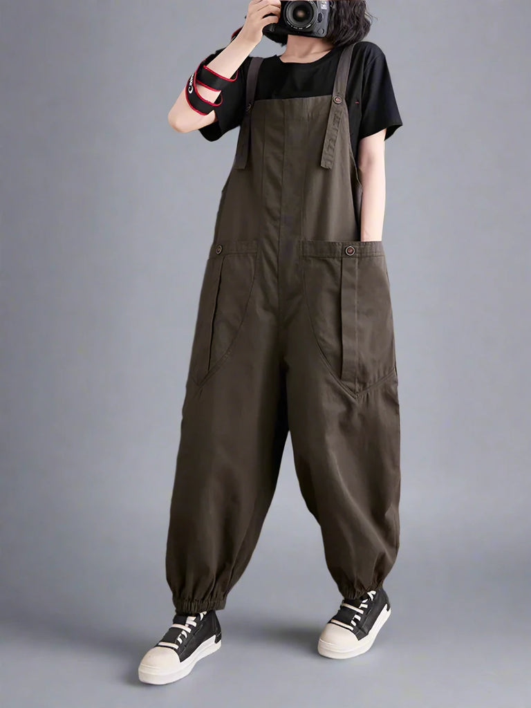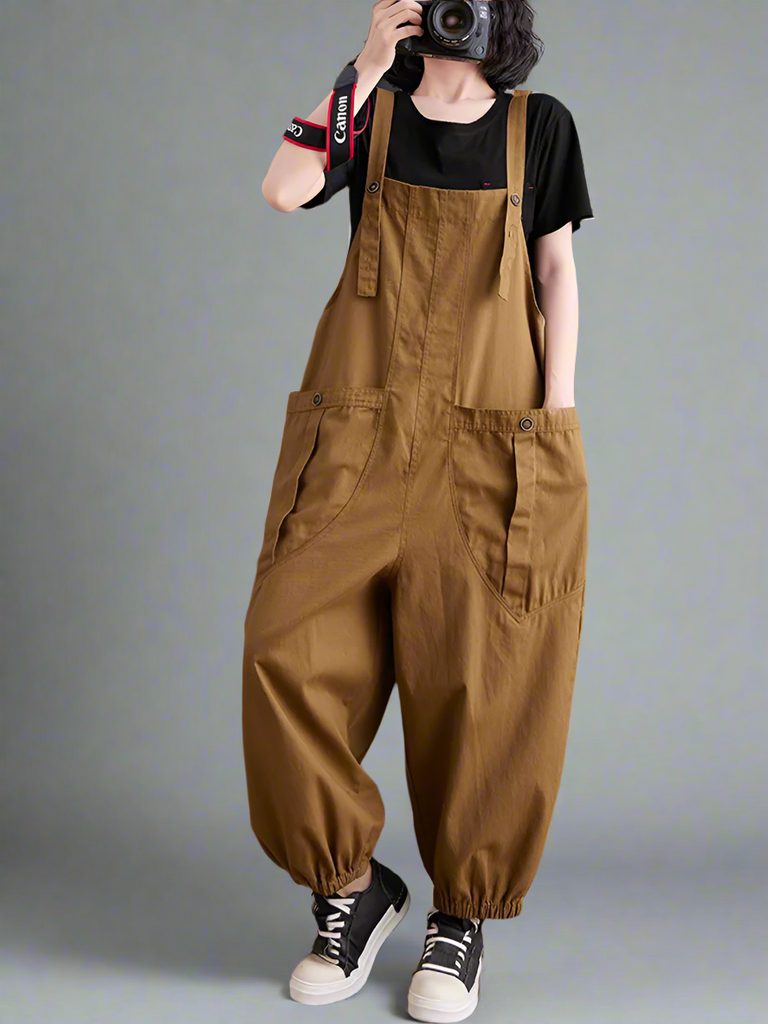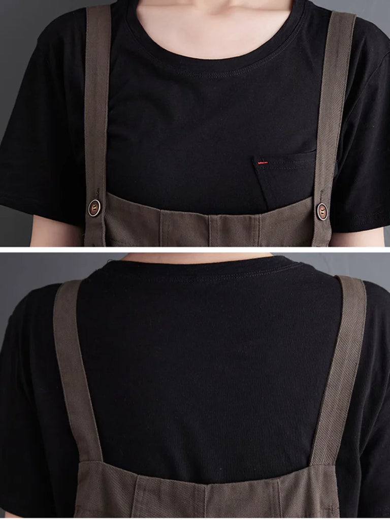 The adjustable straps make sure you can get the perfect fit, and the large front pockets with button details add a nice touch of style. The elastic cuffs at the ankles give them a cool, tapered look, and when paired with black and white sneakers, they create a laid-back, sporty vibe. Whether you're running errands or just hanging out, these dungarees are a comfortable and stylish choice for any casual occasion.
