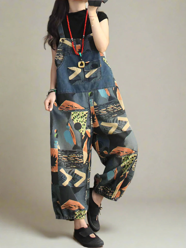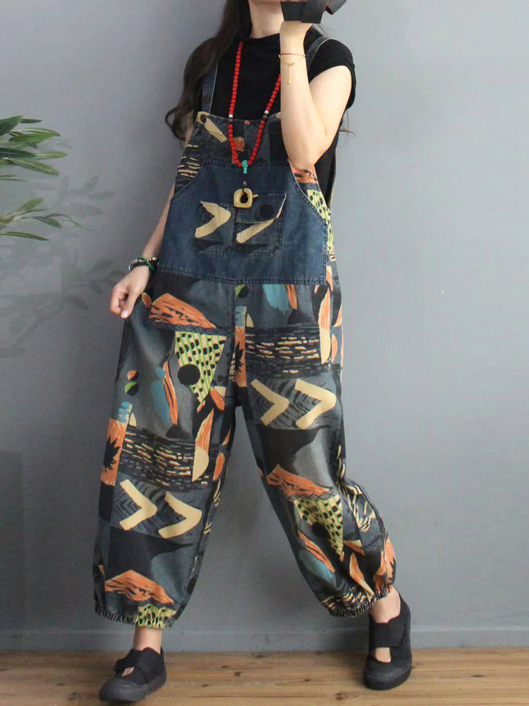 The Abstract Print Overalls Dungarees are a perfect blend of style and comfort with their vibrant abstract print in shades of orange, green, and yellow with a blue base. They are made from soft denim and cotton and feature a flattering high-waist design with a relaxed fit and tapered ankle cuffs for a trendy look. The structured bib area includes two small, slanted patch pockets for a stylish yet functional touch. The adjustable straps with button details allow for a customized fit. A discreet back pocket makes them more stylish. They are ideal for spring, summer, and autumn. You can pair them with t-shirts, tank tops, or sweaters for a modern, artistic outfit.