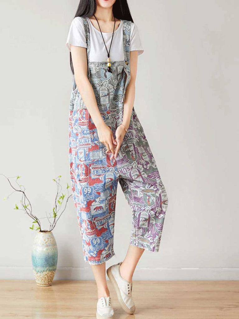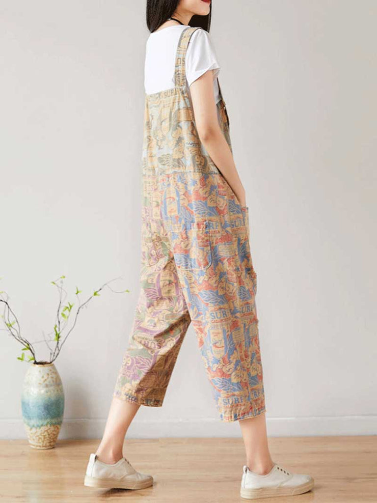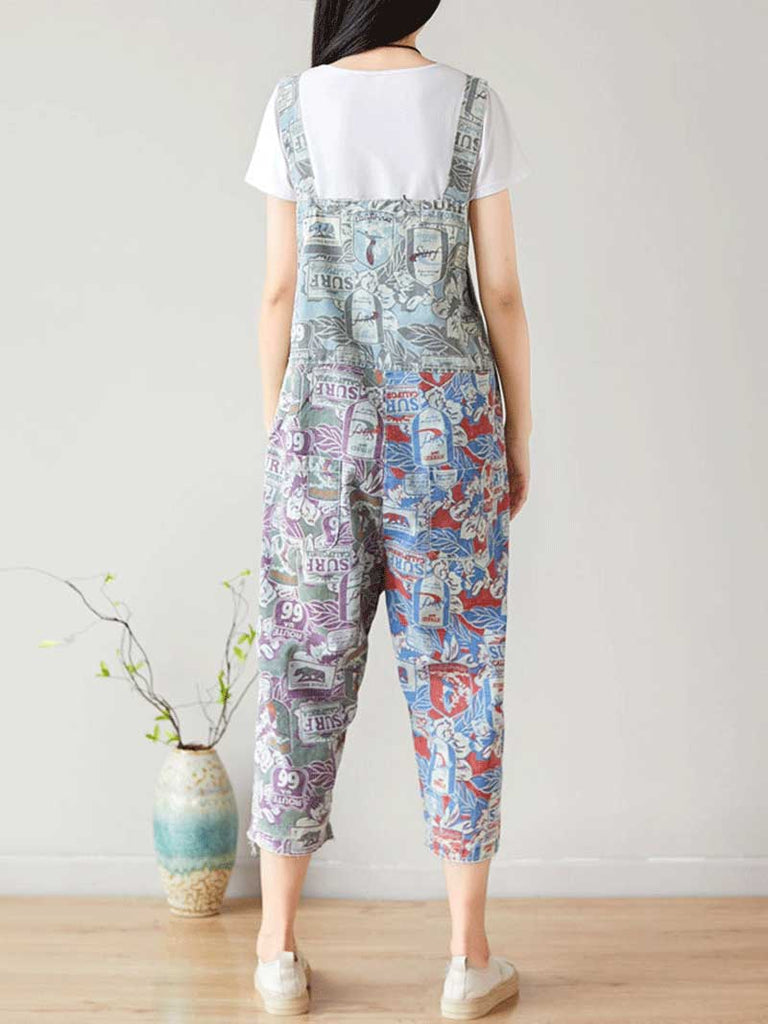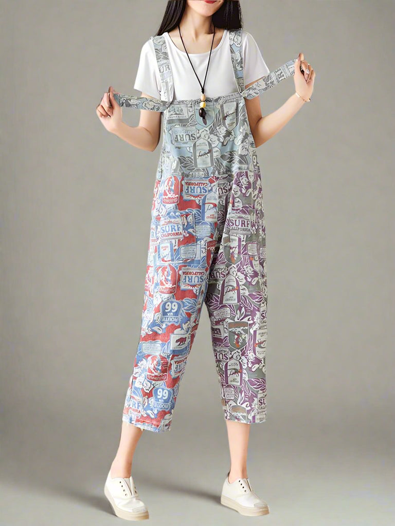 These cropped vintage overalls dungarees feature a unique patchwork design with a mix of bold colors and retro surf-inspired prints. Made from a breathable cotton blend, they offer a relaxed, oversized fit with wide legs for maximum comfort and effortless style. The adjustable shoulder straps ensure a customizable fit, while the multiple pockets add both functionality and charm. The bib-style front and open-back design enhance the laid-back appeal, making them perfect for casual outings or beachside adventures. Paired with a simple white t-shirt, a beaded necklace, and a brown shoulder bag, these dungarees exude a trendy, bohemian aesthetic with a nostalgic touch.
