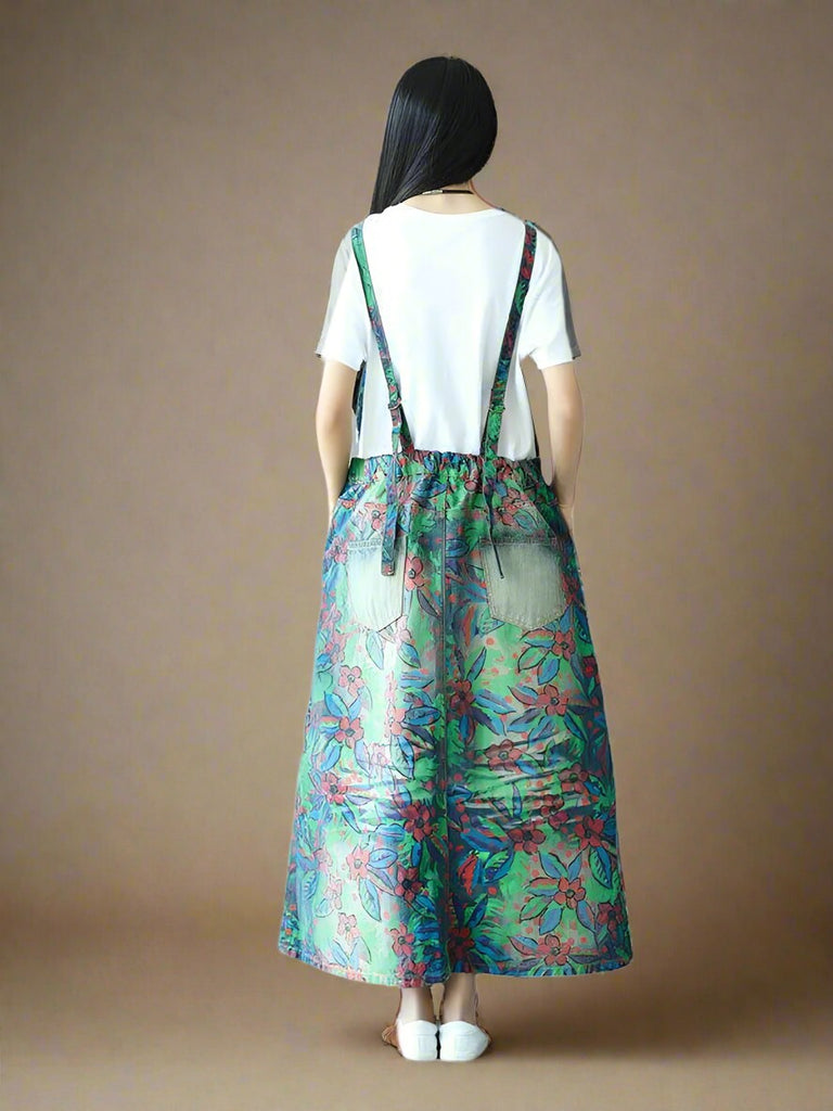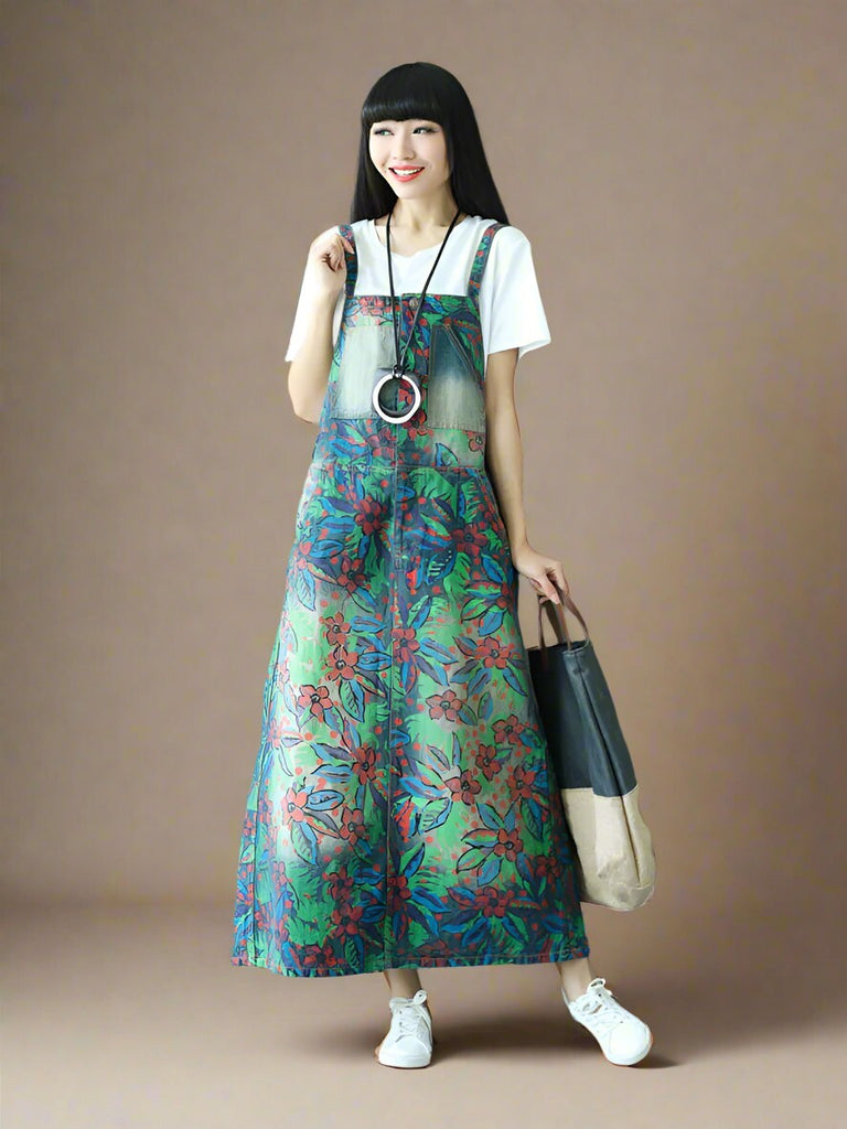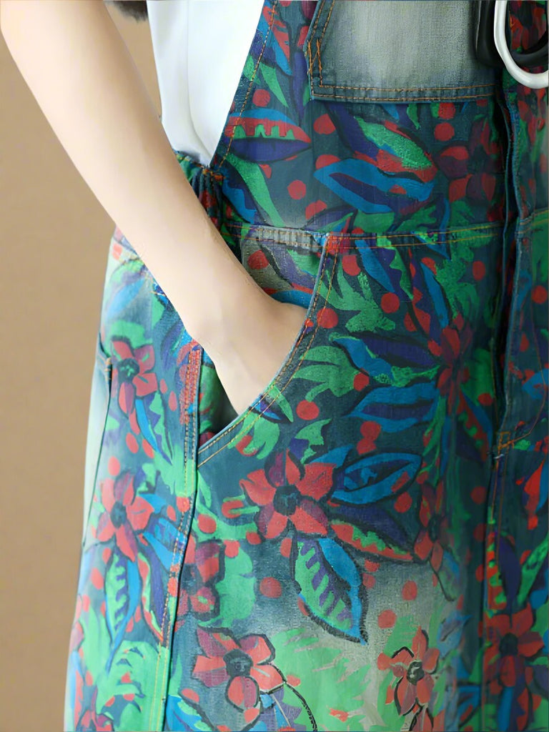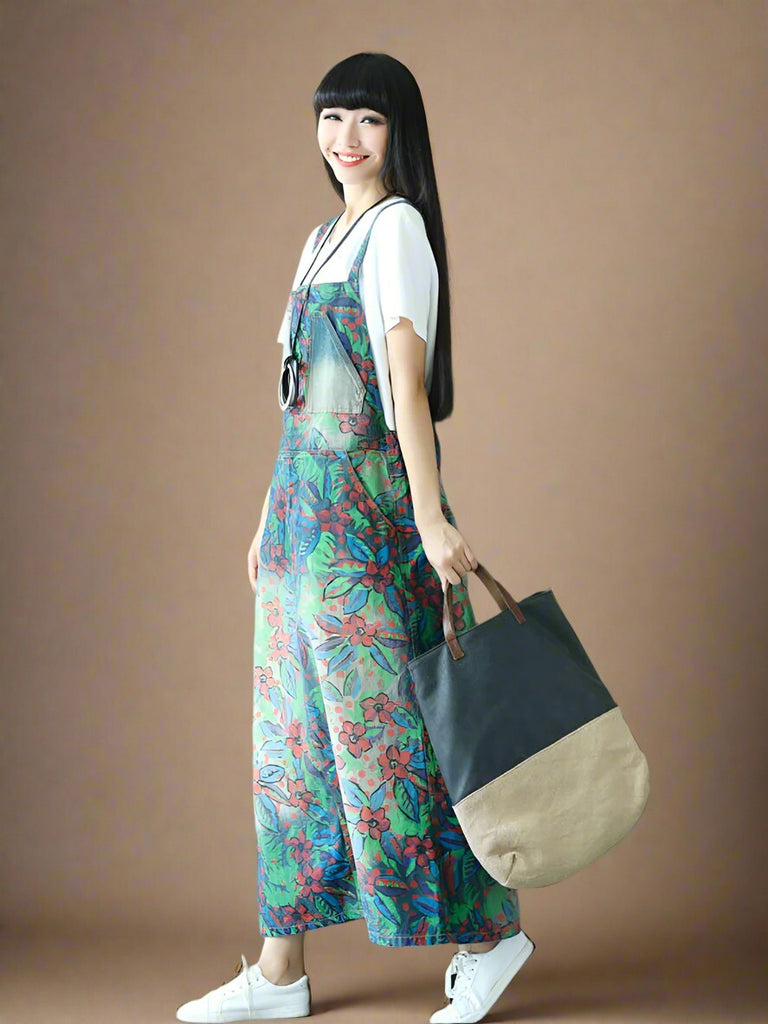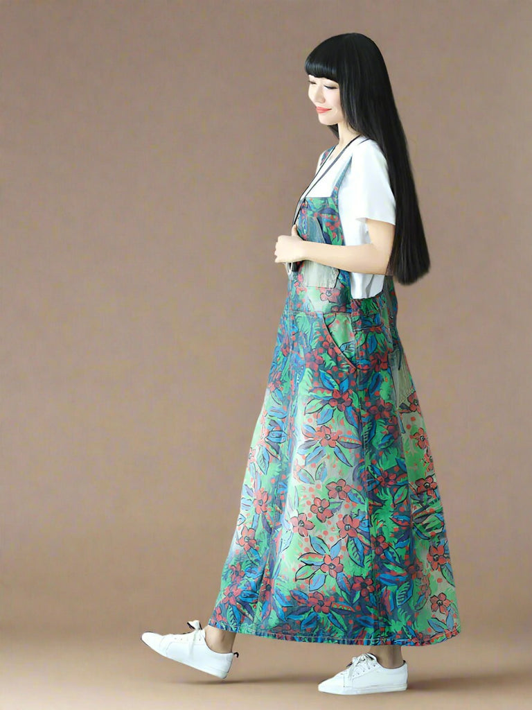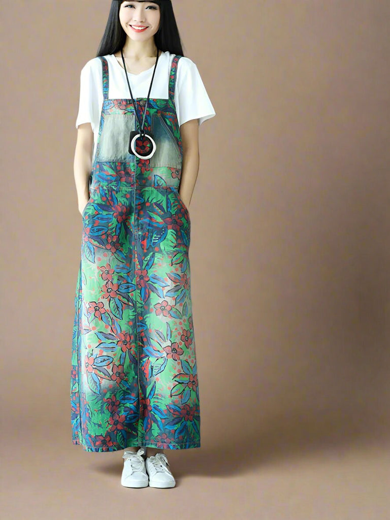 Our Everyday Pockets Overalls Dungarees combine comfort, style, and practicality in one versatile piece. They are made from soft, durable denim cotton and offer a relaxed, full-length fit with vibrant floral prints in shades of green, red, and blue. The front bib design is structured, providing a clean and flattering shape. The back design features an adjustable tie closure for a customized fit, paired with back pockets for added convenience. Whether you are running errands or spending a day out with friends, these dungarees offer an effortless, stylish option for everyday wear.