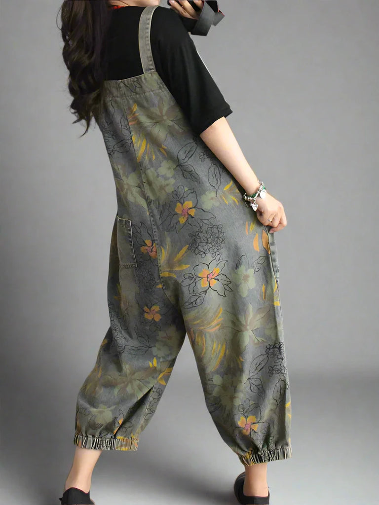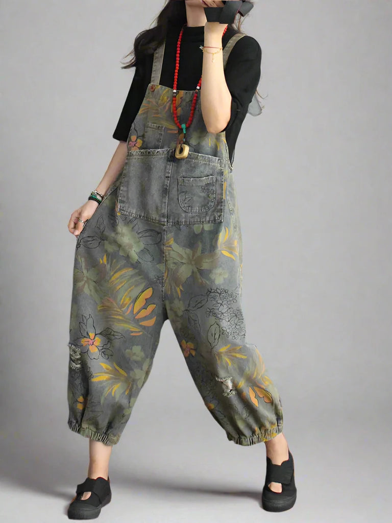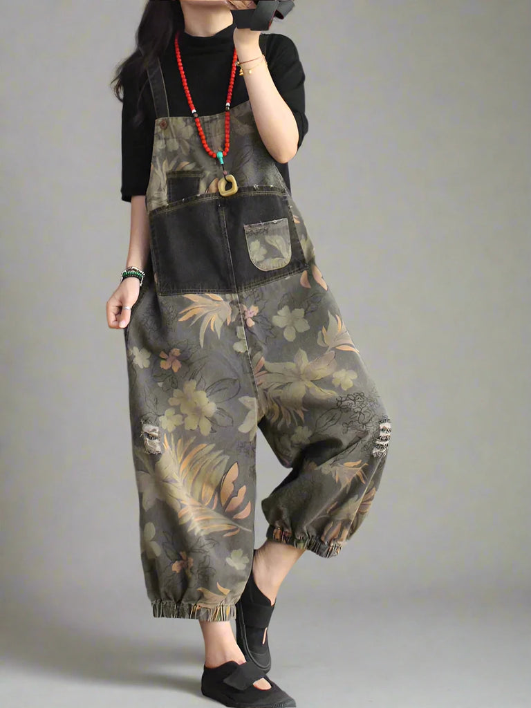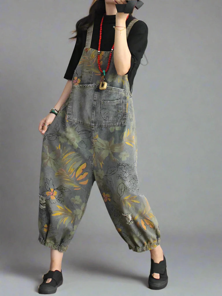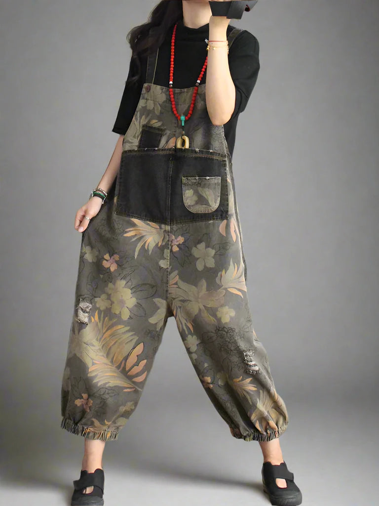 The Floral Print Streetwear Overalls Dungarees bring together bold floral designs with the comfort and durability of denim and cotton. The dungarees feature a vibrant floral print in hues of orange, yellow, and green with a muted base of blue and black. The relaxed fit with adjustable straps makes them ideal for casual outings and the elasticized cuffs at the ankles add a trendy touch. Whether for spring, summer, or autumn, these dungarees can be paired effortlessly with a simple t-shirt or tank top for a fashionable look.