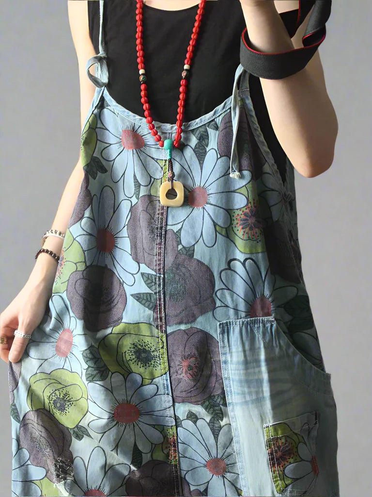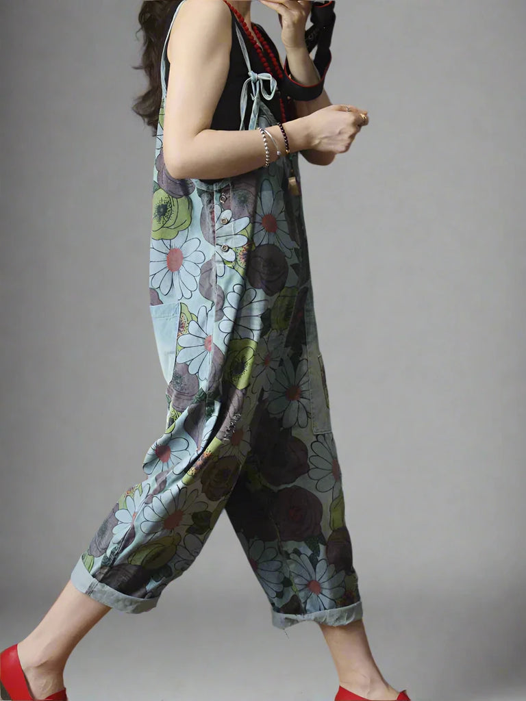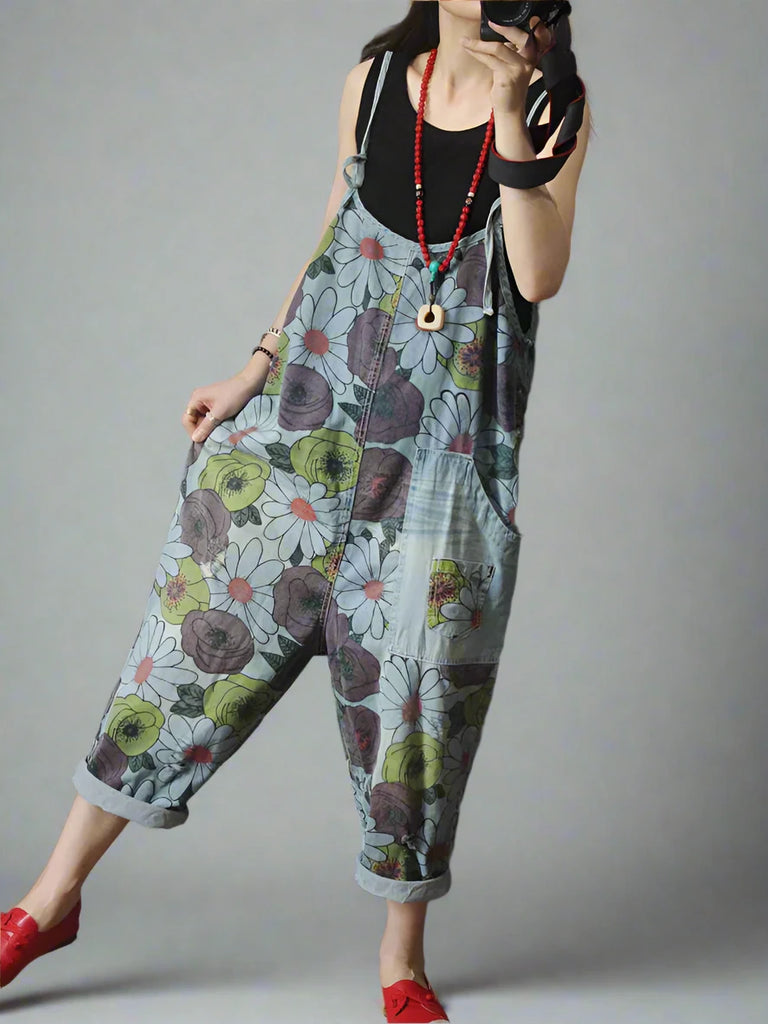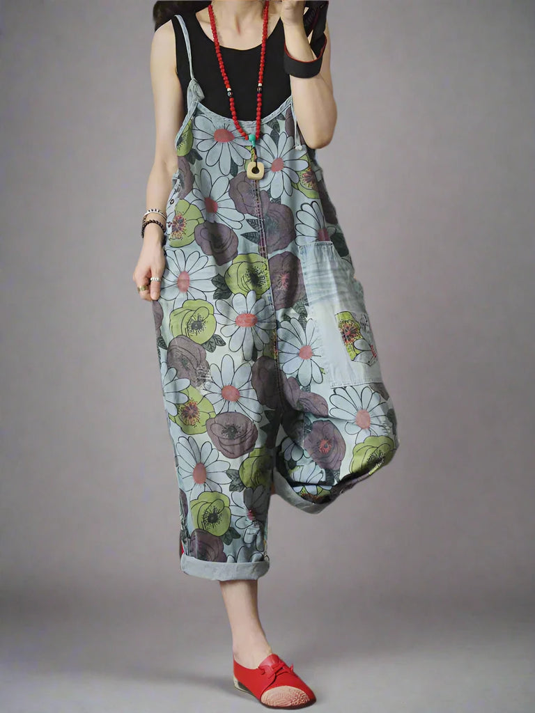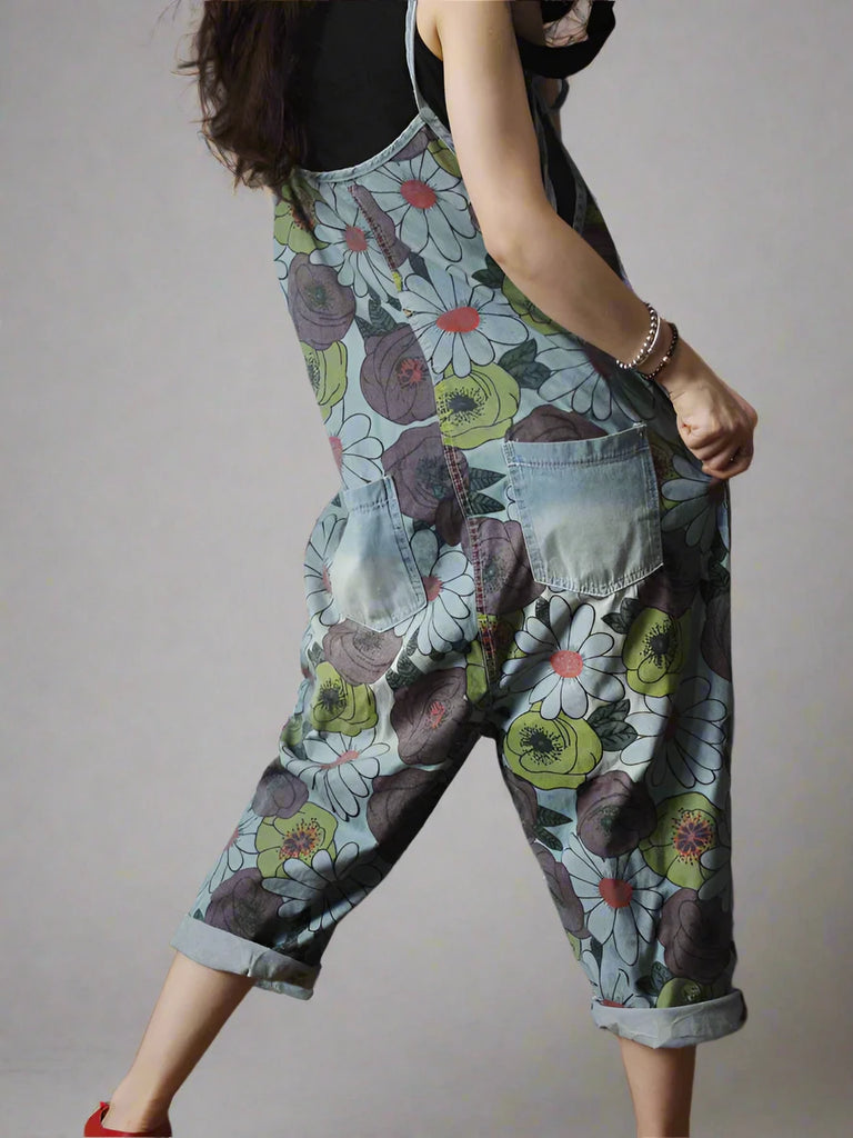 Our High Waist Floral Overalls Dungarees combine artistic design and everyday comfort. They are made from soft cotton denim and feature a beautiful floral print in a mix of muted tones, with vibrant splashes of color. The adjustable straps ensure a customized fit for various body types. With one large side pocket and two back pockets, along with chic rolled-up cuffs at the ankles, these dungarees bring a playful yet stylish vibe. They are perfect for all seasons, they can be paired with a fitted t-shirt or tank top in warmer months, or layered with a cozy sweater or jacket in cooler weather. Complete the look with sneakers, sandals, or ankle boots for a chic vibe.