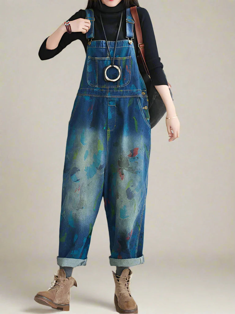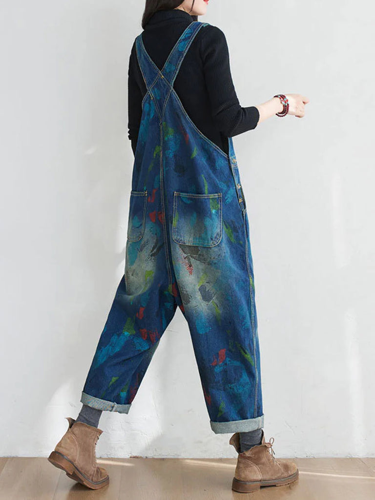 Add a splash of color to your wardrobe with these Watercolor Printed Denim Overalls Dungarees. The lively blue base with a unique watercolor print in red, green, purple, and black gives a fun, artistic vibe. They are made from soft, breathable cotton and are perfect for year-round comfort. The high-waisted, relaxed fit flatters your silhouette, and the rolled cuffs add a casual touch. Adjustable straps ensure a personalized fit, and the structured bib adds a classic overalls look. With two spacious front pockets and back pockets, these dungarees are great for casual outings or lounging. They bring art and fashion together beautifully.