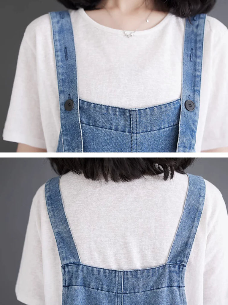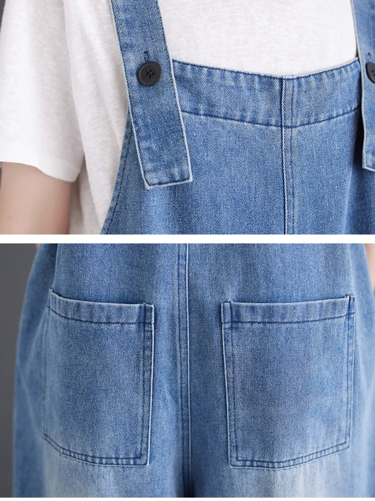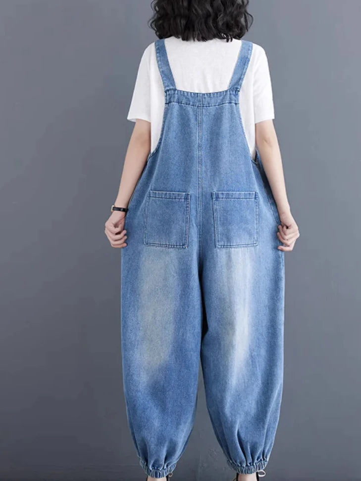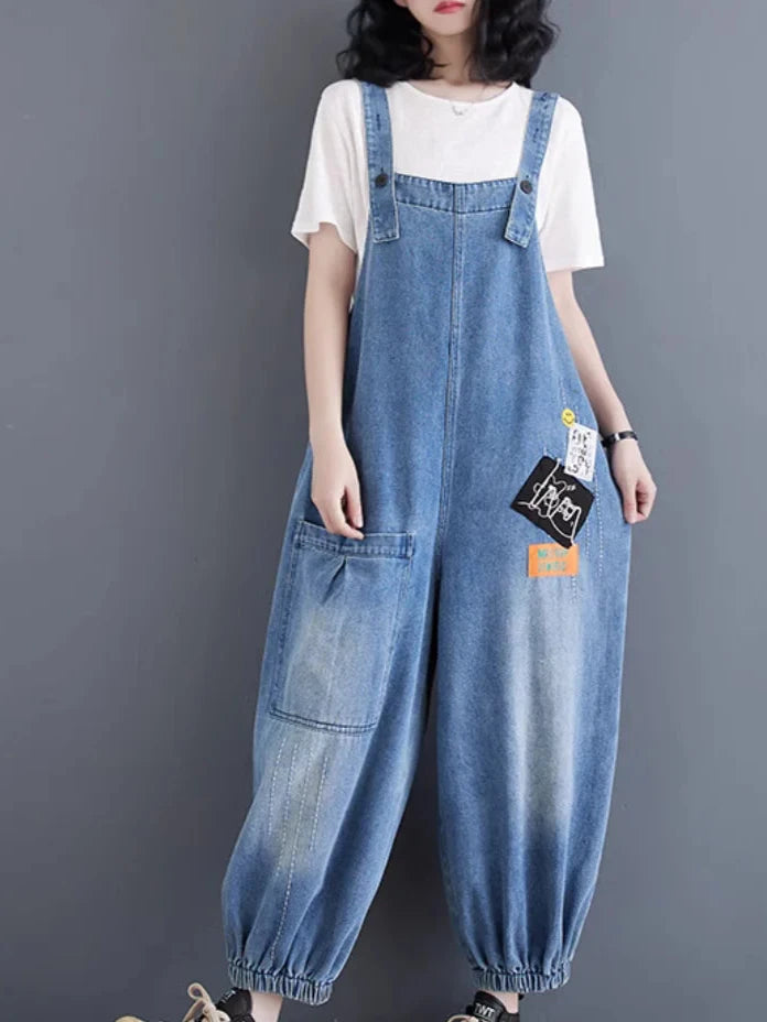 Our Vintage Denim Daze Overalls Dungarees combine style, comfort, and streetwear functionality. They are made from soft cotton-blend denim, which is durable, breathable, and relaxed. The loose fit, wide-leg shape, and elasticated cuffs create a casual, trendy look perfect for lounging, travel, or street fashion. The adjustable buttoned shoulder straps provide a customizable fit, and the large side pocket and two spacious back pockets add practicality. The dungarees feature a vintage-inspired faded wash, distressed details, and decorative graphic patches. Pair it with a tee, sweatshirt, or outerwear for everyday style.